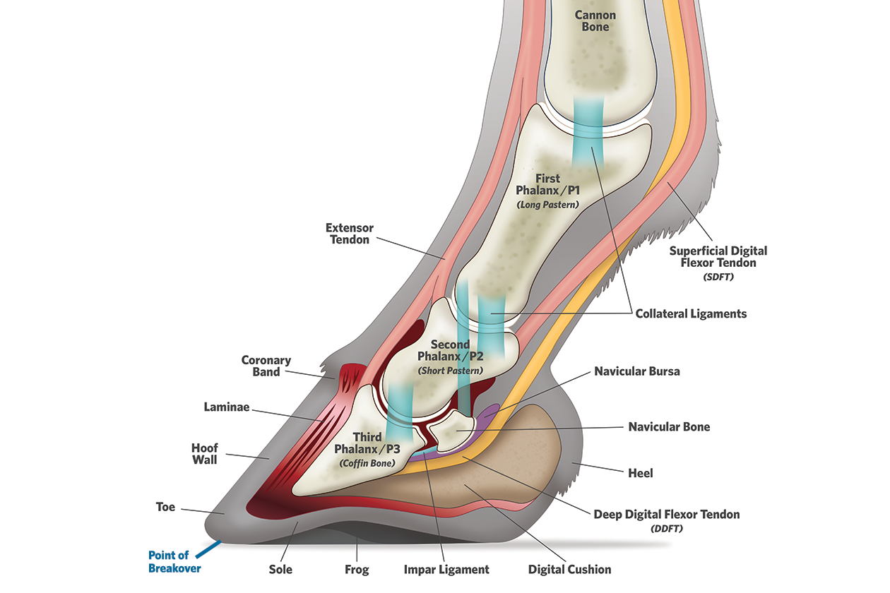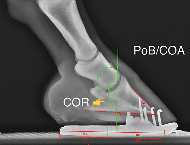 “Breakover is most commonly measured from the place where the shoe or hoof stops contacting the ground, then to the tip of P3 (also known as the coffin bone, distal phalanx or pedal bone). That distance is what we refer to as the breakover distance.”