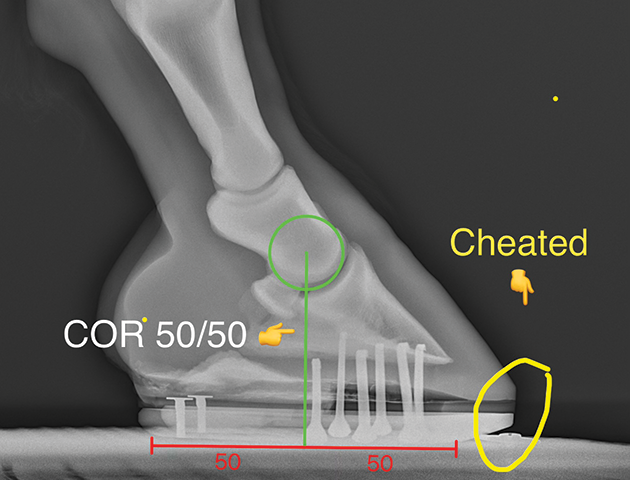 “It is often common practice to set the shoe back off the toe like you see in this radiograph with a ‘cheated’ toe. Here, I was attempting to make the radiographs perfect to the Center of Rotation (COR) 50/50, but in doing so, I was weakening the hoof wall.”