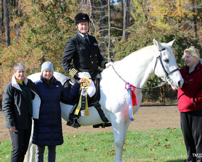 I am so grateful to The Dressage Foundation for spotlighting older horses and riders. I had so much help for my test; you cannot do it alone. I thank Erin, Rick, Rebecca, Greg, Cameo, Tina, Astrid, Nancy, Myra (Myra rode Charlie in 2016 into the Century Club), and Sue Martin who allowed us to ride at her farm. I am so very proud that Charlie can finish his showing career inducted into the Century Club, thanks to The Dressage Foundation.”