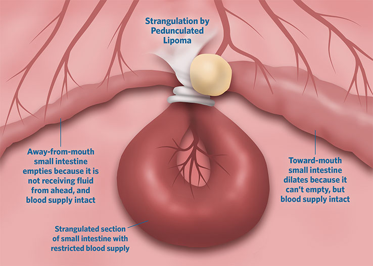 Strangulating obstructions can be significantly more serious and can include volvulus obstructions where a section of the large intestine twists or tangles around itself causing a blockage that can cut off vital blood supply.