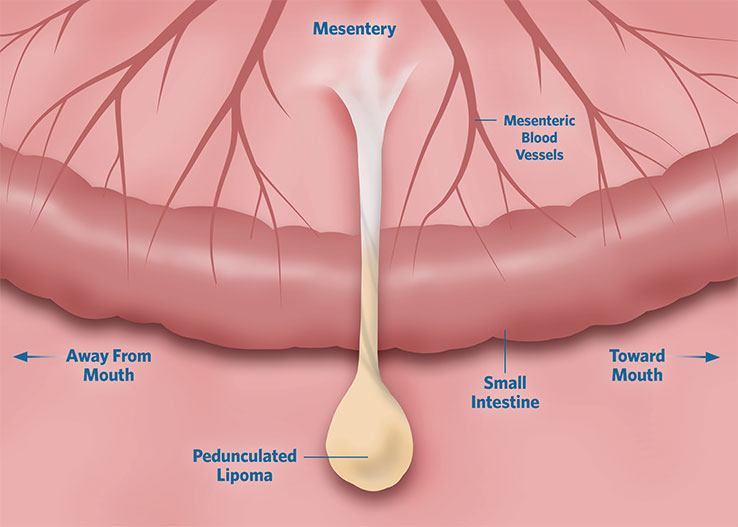 Pedunculated lipoma wrapped tightly around a segment of small intestine, constricting its blood supply.