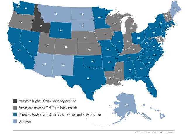 Broken down, EPM has two bad actors at play, per se. The condition is caused by the protozoa Sarcocystis neurona (S. neurona) and, in some cases, the less frequent culprit of Neospora hughesi (N. hughesi). Zeroing in on S. neurona, this parasitic organism requires both a definitive host, known to be the opossum, and an intermediate host, identified as skunks, raccoons, armadillos, cats and, unexpectedly, sea otters. As the definitive host, the opossum acquires the parasite from an intermediate host, then sheds an infective form of the parasite, known as a sporocyst, in its feces. Horses are exposed to the infective organism by ingesting traces of opossum feces by way of contaminated feed, hay or water. Once ingested, the parasite eventually becomes what’s known as a merozoite. In a small percentage of cases, merozoites can make their way to the central nervous system and thus cause EPM. While the thought of EPM-induced neurologic symptoms may sound frightening, there’s a silver lining. An incredibly high percentage of horses have been exposed to S. neurona and are considered seropositive with antibodies against the organism. In fact, the number can be as high as between 53 percent and 90 percent depending on geographic location, with warm, humid locations as well as the state of California being hotspots. On the other hand, according to the American Association of Equine Practitioners (AAEP), only roughly 20 percent of horses in certain areas of the country will test positive for antibodies to the less common N. hughesi. Now for the silver lining — while exposure rates are alarmingly high, only between 0.14 to 1 percent of horses will ever develop clinical symptoms of EPM. The ability to definitively test for these antibodies has given veterinarians an important diagnostic tool, but one that comes with a caveat. The blood test is helpful, yes, but it does not, in fact, indicate whether or not a horse has EPM or will ever exhibit neurological symptoms. It simply indicates they’ve been exposed to the organism.