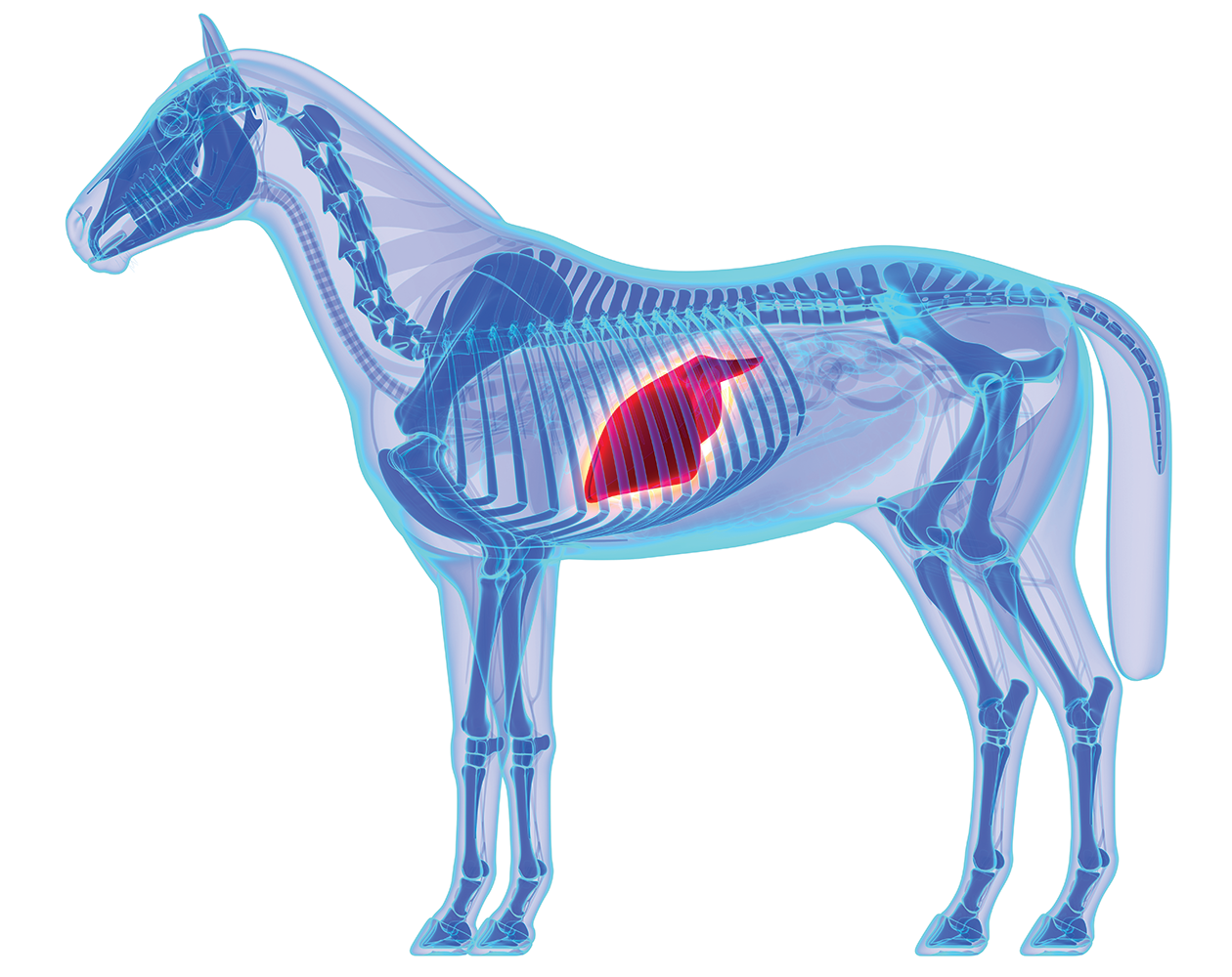 The liver in a horse has a big job and the tools to do it. It’s the largest internal organ, weighing about 11-13 pounds, or about 1.5% of the total body weight of a mature horse. Consequently, the liver plays a critical role in the animal’s overall health and well-being, performing detoxification and filtration, metabolizing carbohydrates, proteins and fats, producing bile for digestion, providing immune support and more. Yes, it’s a heavy lift, but the liver has size with capacity enough to store essential staples of energy — glycogen and triglycerides — nutrients and essential fat-soluble vitamins including A, D and E, as well as being a major repository for iron (as ferritin/hemosiderin) and copper. And if that’s not enough, it is also capable of generating new replacement liver cells, which provide some protection against other challenges because the liver is also at risk of injury — and worse.