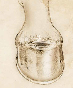 What may be less familiar is the unseen hoof. The living, breathing, sensitive tissues underneath these familiar parts are charged with much of the growth, circulation and nourishment of the entire hoof. Analogous to the quick of the human fingernail, the corium is the part of the hoof that produces new hoof growth, or the hoof horn and contains an intricate network of blood vessels and nerves. The laminar corium (sensitive laminae) is laminae engorged with blood vessels. It attaches to the innermost layer of the hoof wall, in a Velcro-like way on one side and firmly attaches to the pedal bone on the other side. The solar corium (sensitive sole) contains hair-like laminae also teeming with blood vessels. It attaches to the sole and the frog and supplies nutrients for growth. The digital cushion resides on top of the frog and behind the pedal bone, viewed on the outside of the hoof as the bulbs of the heel. It is a tough yet elastic structure that reduces concussion to the foot and supports heel expansion as well as assisting in circulation. Lateral cartilages, the pedal bone and the navicular bone also make up the inner structure of the amazingly tough yet also delicate hoof.
