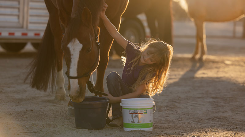 Probiotics are a way to optimize the health of the digestive tract and are recommended for many situations: traveling horses, horses on high grain diets, senior horses, horses that are more sensitive to stress. Health benefits of both pre- and probiotics are well-documented within the intestinal tract and include increased nutrient digestibility and feed efficiency improvements. This is significant for all horses, but certainly for horses prone to colic episodes. Saccharomyces cerevisiae is a yeast species that optimizes starch and fiber utilization. Supplementation with S. cerevisiae may limit the detrimental effects of a decreased pH of the cecum and colon and increased concentrations of lactic acid commonly seen with today’s high starch feeding practices. Another probiotic strain, Saccharomyces boulardii, offers immune and anti-pathogenic advantages. S. boulardii prevents adherence of pathogens to intestinal cell walls and can neutralize common toxins in the GI tract. Glutamine is a very important amino acid to intestinal health. It maintains healthy intestinal cells, reduces the permeability of the gastrointestinal tract to pathogens and improves the immune response at the level of the intestinal cell. As an antioxidant, it provides defense against elevated levels of free radical and oxidative stress and stimulates intestinal cell growth. These are all beneficial nutrients to support general digestive integrity and can all be found in Platinum Performance® GI, Platinum Performance® DJ and Platinum Balance®. Dr. Smith recommends Platinum GI for colic prone horses. “At every one of my barns, there’s 1 or 2 horses that are just naturally more sensitive and more likely to colic. Those are the ones that I always strongly recommend go on a comprehensive wellness formula that contains probiotics like Platinum GI. It really helps to keep their gut calm and acclimates the bacteria in the hindgut so they can deal with small changes in their diet or stressful situations much better.”
