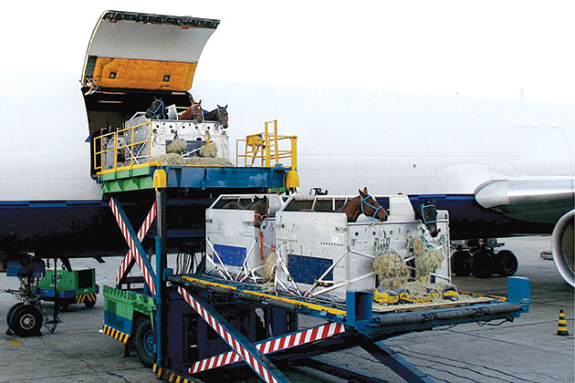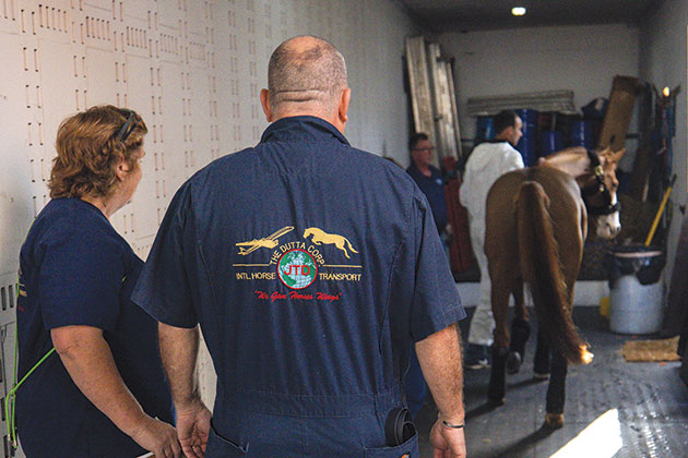 Upon arrival to their final destination, horses are evaluated by the international transport company's staff and a veterinarian. The Dutta Corp. staff is seen here with a horse in transit.