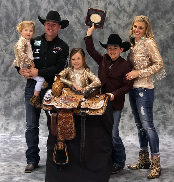 Trevor Brazile poses with his family — his wife, Shada, and their children Swayzi (in Trevor's arms), daughter Style and son Treston — after winning the all-around at the 2018 WNFR.